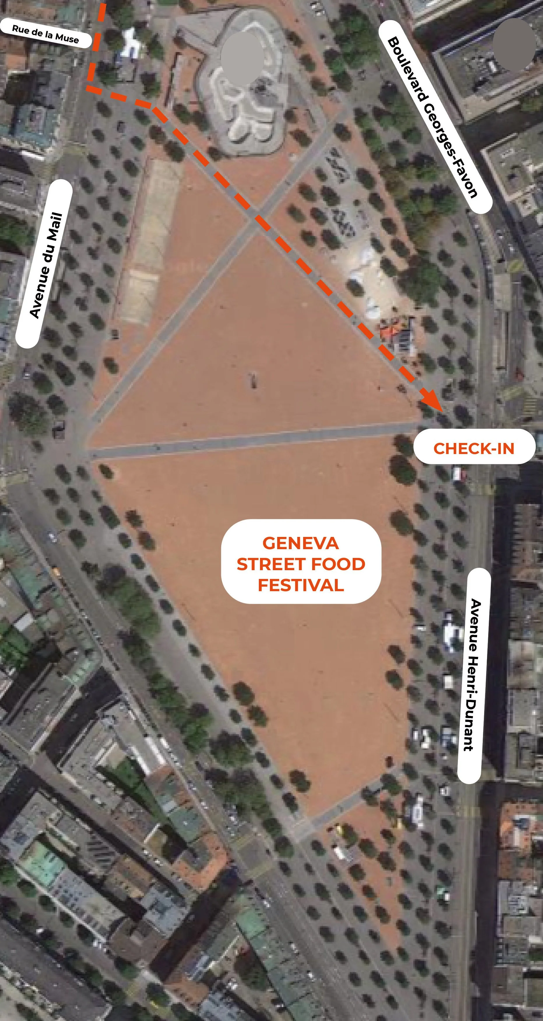 > Accès à la Plaine de Plainpalais tous les jours à la hauteur de la rue de la Muse. Attention aux piétons et aux enfants !